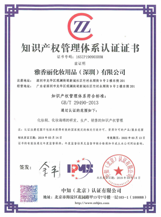 熱烈祝賀雅香麗(深圳)化妝用品有限公司榮獲知識(shí)產(chǎn)權(quán)管理體系認(rèn)證證書
