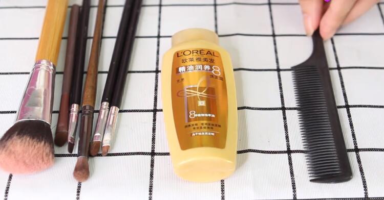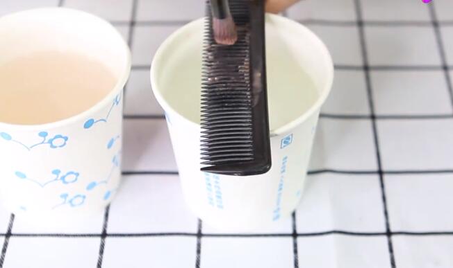 (一杯清水、一杯放入洗發(fā)露,把刷子在水中清洗一次再用梳子來(lái)回摩擦)